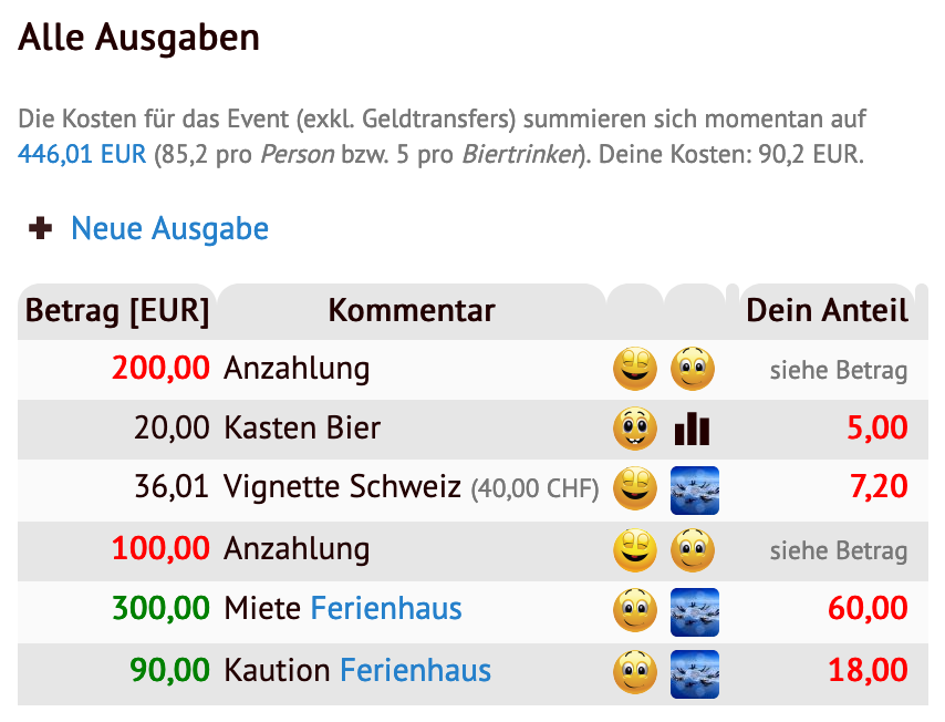 Wir sehen hier die Liste aller Ausgaben aus der Sicht von " Michael". Die für ihn relevanten Ausgaben sind rot und grün dargestellt. Sein persönlicher Saldo ergibt sich aus der Summe der grünen Zahlen minus der Summe der roten Zahlen.