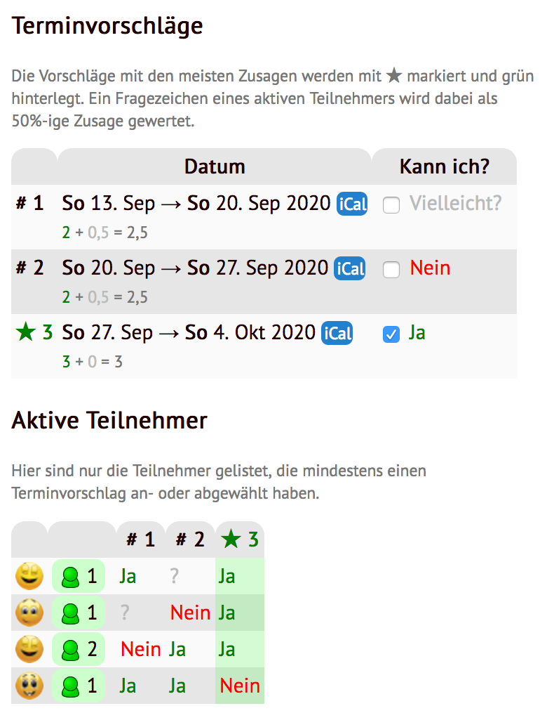 Das Finden eines gemeinsamen Termins ist häufig der erste Schritt der Planung. Der Organisator kann auf dieser Seite Vorschläge erstellen und danach Einladungen an die Teilnehmer senden. Wenn diese ihren Einladungslink aufrufen, werden sie als erstes darum gebeten, anzugeben ob sie an den jeweiligen Terminen Zeit haben. GroupEvent® setzt die Personenzahl pro Teilnehmer zu diesem Zeitpunkt auf 1 Person. Der Terminvorschlag mit den meisten Zusagen ist immer mit einem Stern gekennzeichnet.